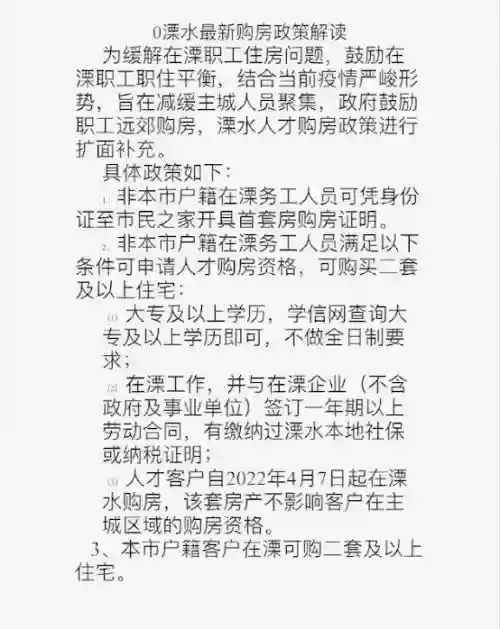 近日,有传言称南京溧水区或将放松限购政策。其中重点内容包括:非本市户籍在溧务工人员可凭身份证开取首套购房证明;满足条件的人才可购买二套及以上住宅(大专以上学历、在溧水企业工作并签订一年以上劳动合同);人才客户自2025年4月7日起在溧水购房,该套房产不影响客户在主城区域的购房资格。