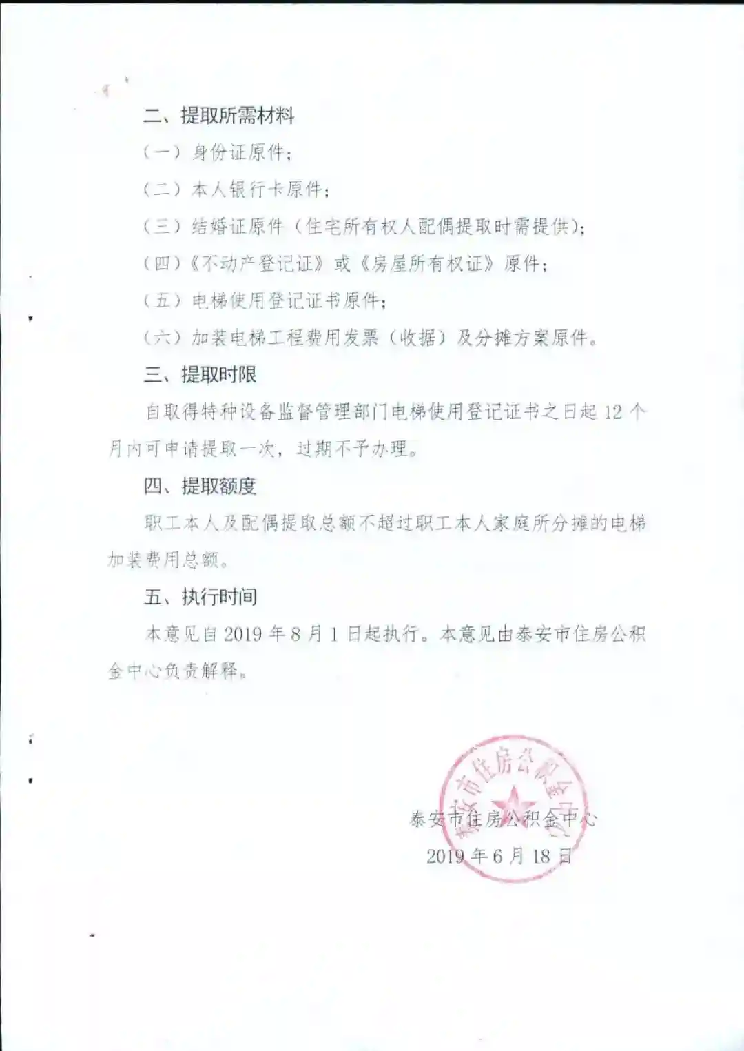 根据《关于运用综合政策措施支持扩大消费的意见》(鲁政发(2016)22号)文件精神,为减轻加装电梯给职工带来的经济压力,进一步发挥住房公积金服务民生的积极作用,经泰安市住房公积金中心研究,同意开展既有住宅加装电梯提取住房公积金业务,现将有关事项通知如下。