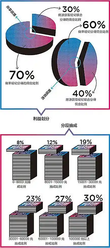 在一个月内,如一名经纪完成多宗交易,“业绩”会累加,根据累进的抽成比例进行提成,8%—30%不等,由于房价猛涨,标准已数度调整。