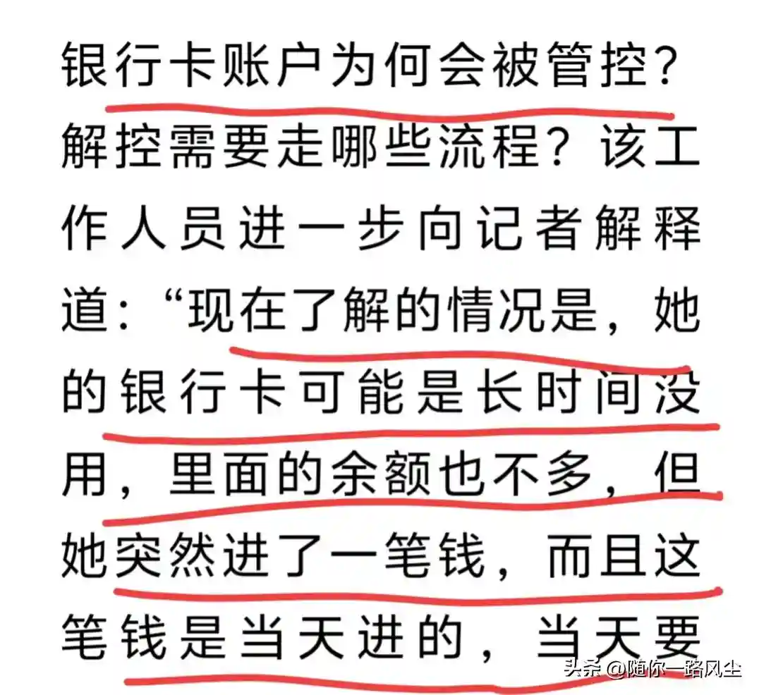 由于女子的账户,长时间没有使用,突然在当日存进去2.5万元钱。可女子又要赶在当日取款,因此才被管控,需要核实一些详细信息。