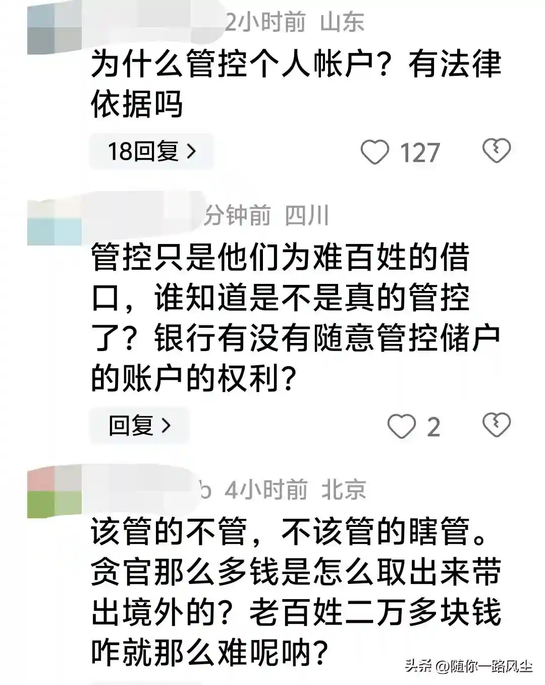 有网友提出疑问:为什么管控个人帐户?有依据吗?管控只是他们为难的借口,谁知道是不是真的管控?银行有没有随意管控储户的账户的权利?