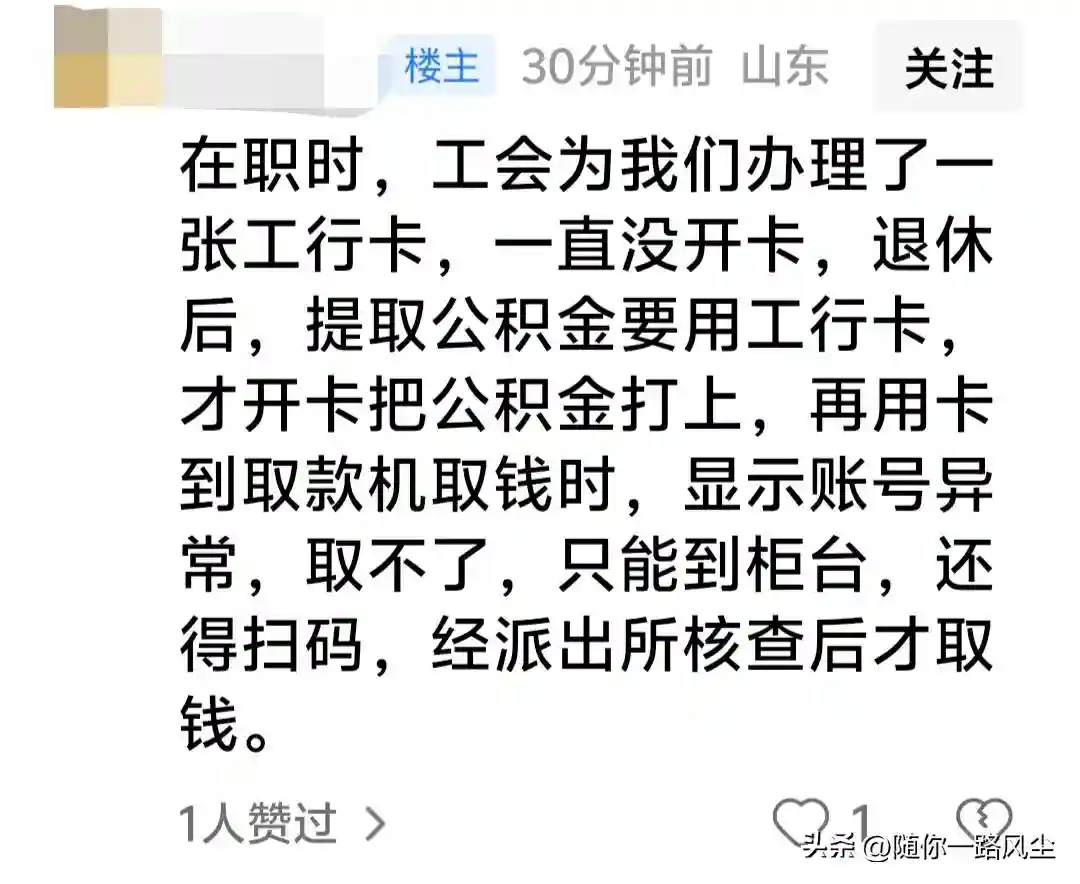 也有网友分享:在职时,工会为我们办理过一张工行卡,一直没开卡。退休后,提取公积金要用工行卡,才开卡把公积金打上,再用卡到取款机取钱时,显示账号异常,取不了。只能到柜台,还得扫码,经派出所核查后才能取钱。