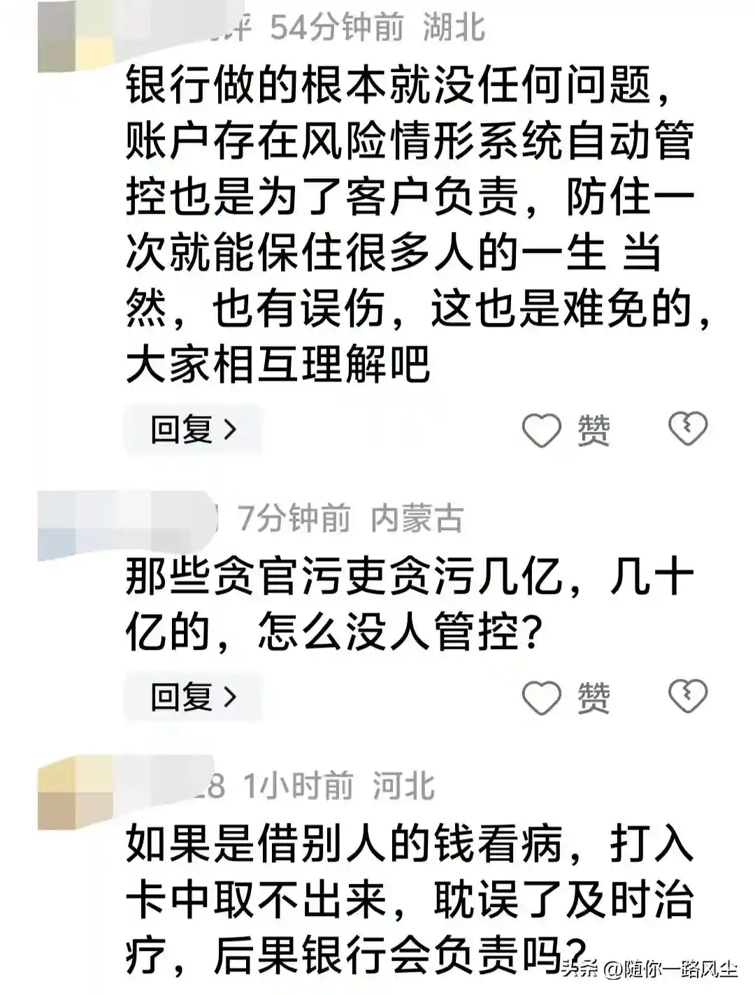 还有网友认为:银行做的,根本就没任何问题。账户存在风险情形,系统自动管控,也是为了客户负责。防住一次,就能保住很多人的一生。当然,也有误伤,这也是在所难免的,大家相互理解吧!