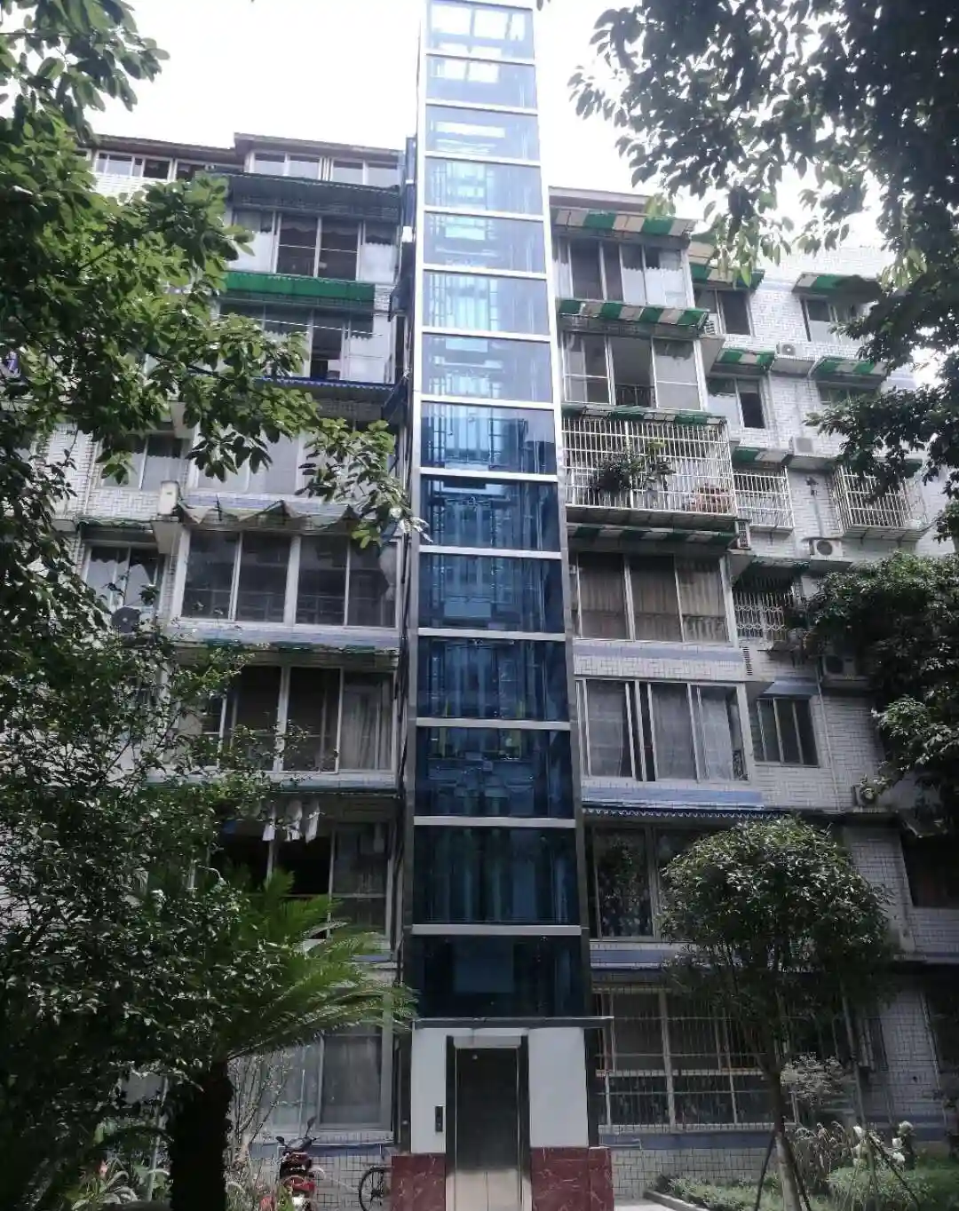 19日下午,记者来到了上述谭先生所在的小区。在4栋3单元楼下,新的电梯正在使用中。相比起如今成都新房内部电梯,老小区搭建得更像“观光电梯”: