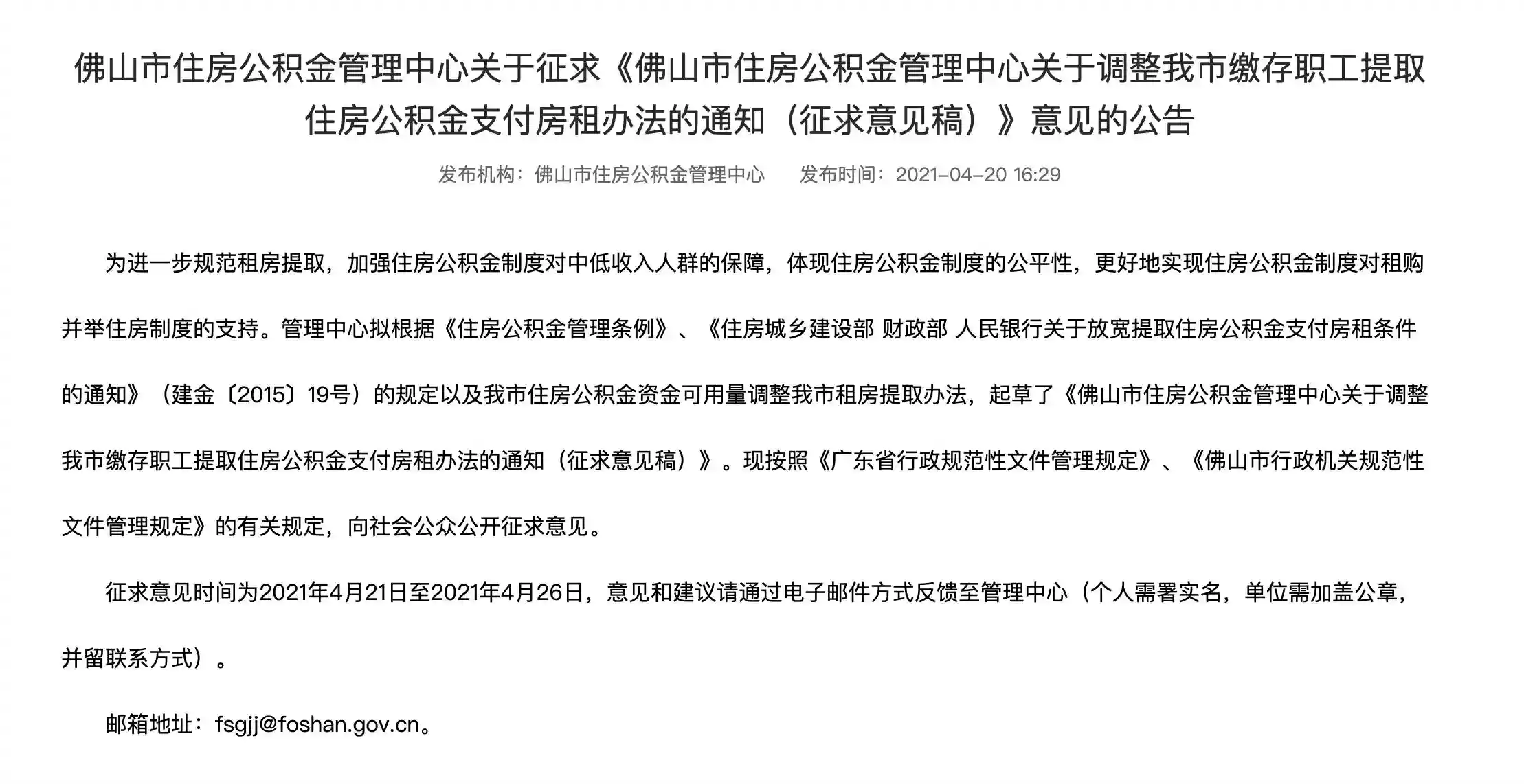 03收紧租房提取额度上一次调整还不足三周,佛山再度传出公积金“收紧”的信号。4月20日,佛山市住房公积金管理中心发布关于调整提取住房公积金支付房租办法的征求意见稿,拟对租房提取条件、额度等作出调整。