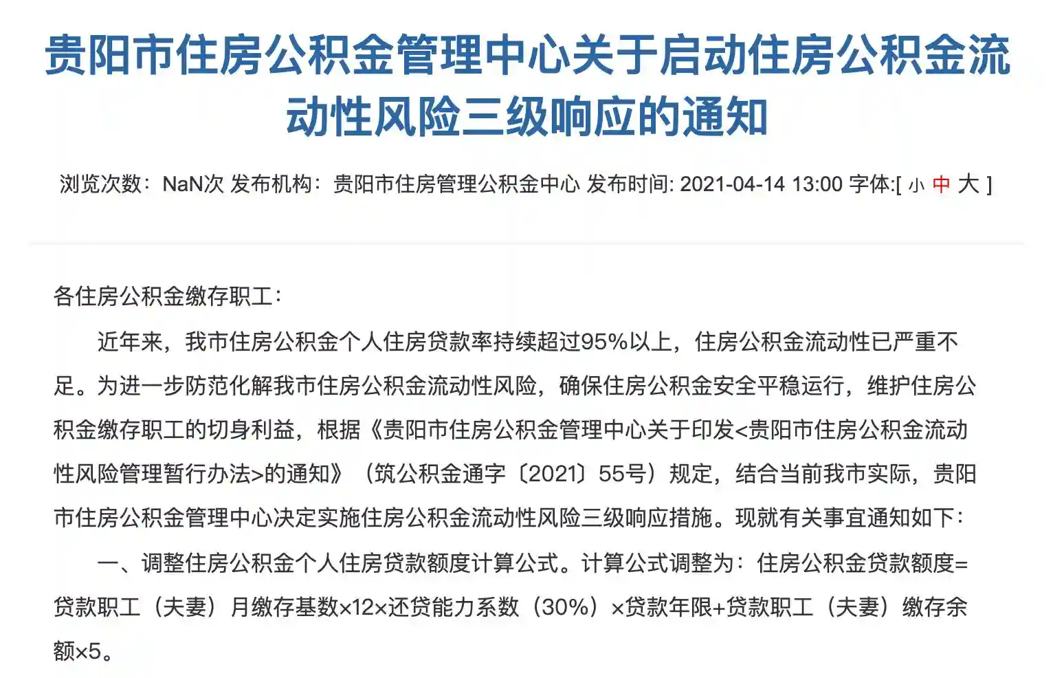 4月14日,贵阳启动住房公积金流动性风险三级响应措施,进一步收紧公积金贷款额度,规定自4月15日起,调整住房公积金个人住房贷款额度计算公式:住房公积金贷款额度=贷款职工月缴存基数×12×还贷能力系数(30%)×贷款年限+贷款职工(夫妻)缴存余额×5。