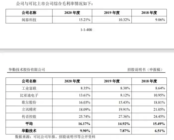 在7家可比同行业上市公司中,华勤技术的综合毛利率仅高于工业富联,远低于行业平均15.49%、14.92%和16.17%的水平。