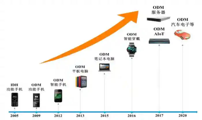 简单的说,ODM就是智能硬件产品的代工厂,典型代工厂商就是知名企业富士康。因为不需要较高技术含量,ODM行业早已是红海竞争,行业早期行业典型厂商多布局在韩国、我国台湾地区,如广达、仁宝、和硕、纬创、英业达等,2000年之后逐渐向国内转移。