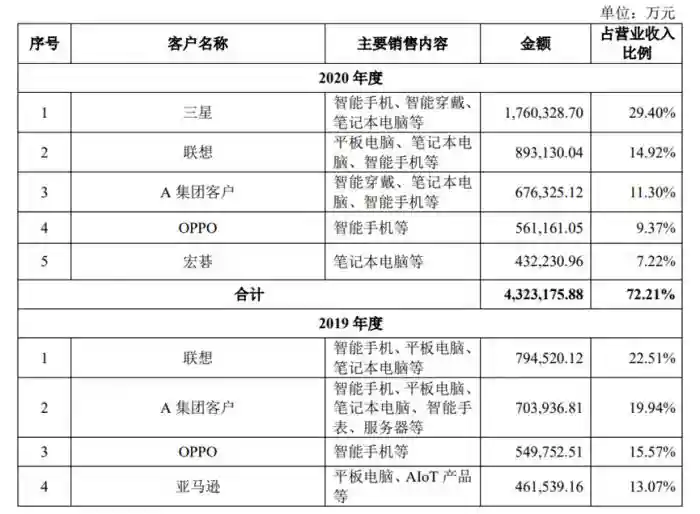 21世纪经济报道记者注意到,公司不仅存在业绩波动风险,其对大客户的依赖也同样严重,报告期内,公司对前五大客户的销售收入合计占比均在约80%,其中各期对第一大客户的销售收入占比约30%。2025年公司第一大客户为联想,2025年则变为三星公司。